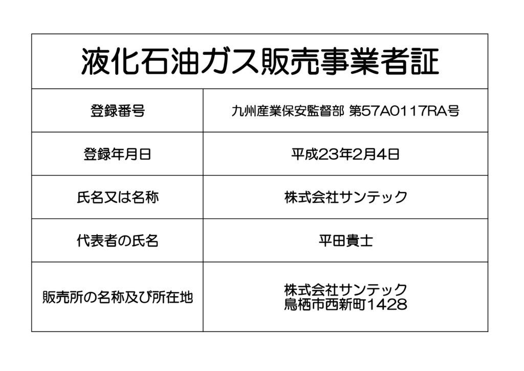 | 認可事業登録番号 | 液化石油ガス製造事業 佐賀県第36号 液化石油ガス販売事業 九州産業保安監督部 第57A0117RA号 液化石油設備工事 佐賀県第100号 | |